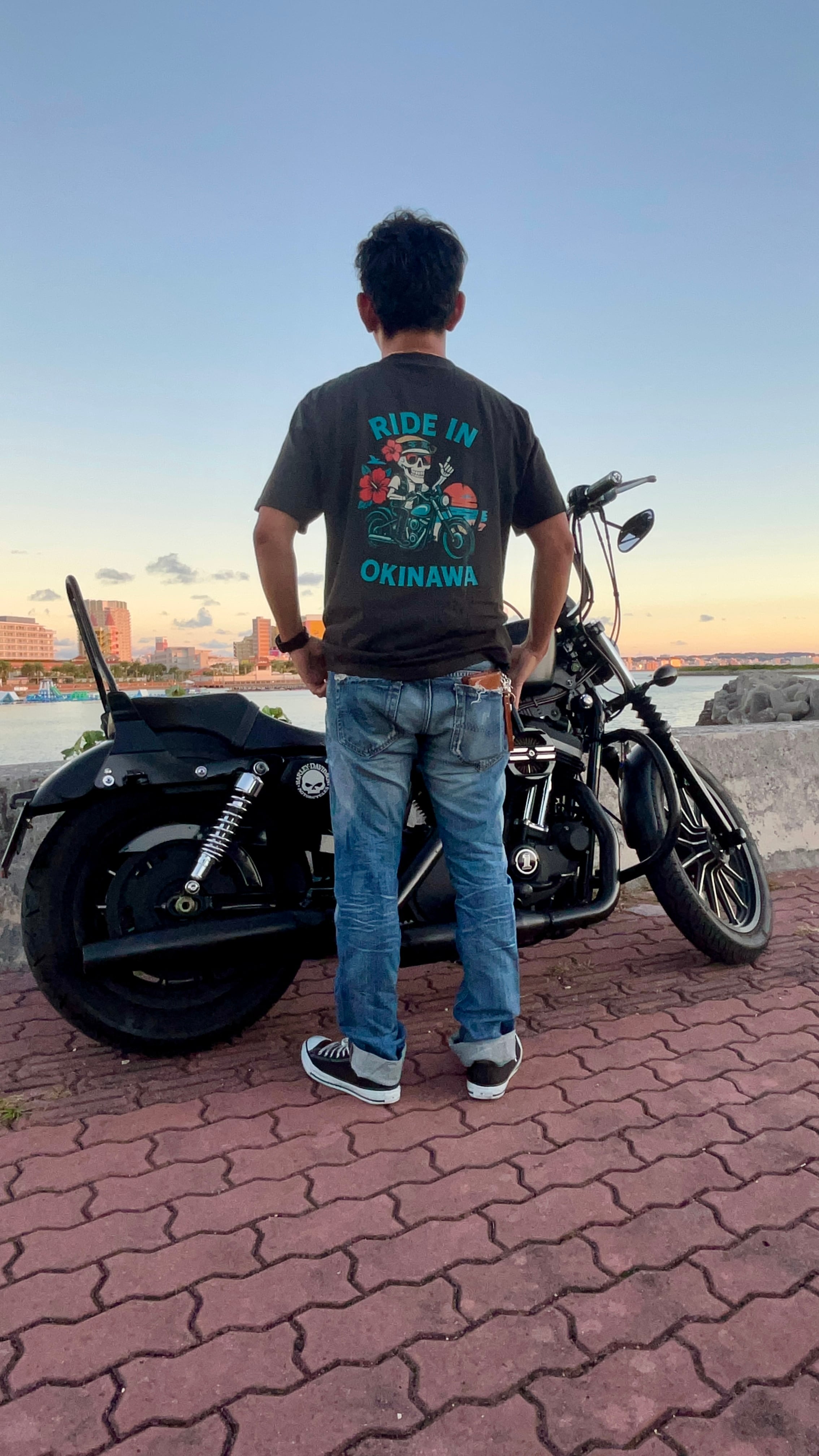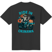 沖縄の青い海と太陽を感じるターコイズ&サンセットカラーで仕上げた、Ride In Okinawa公式メインキャラクターTシャツです。